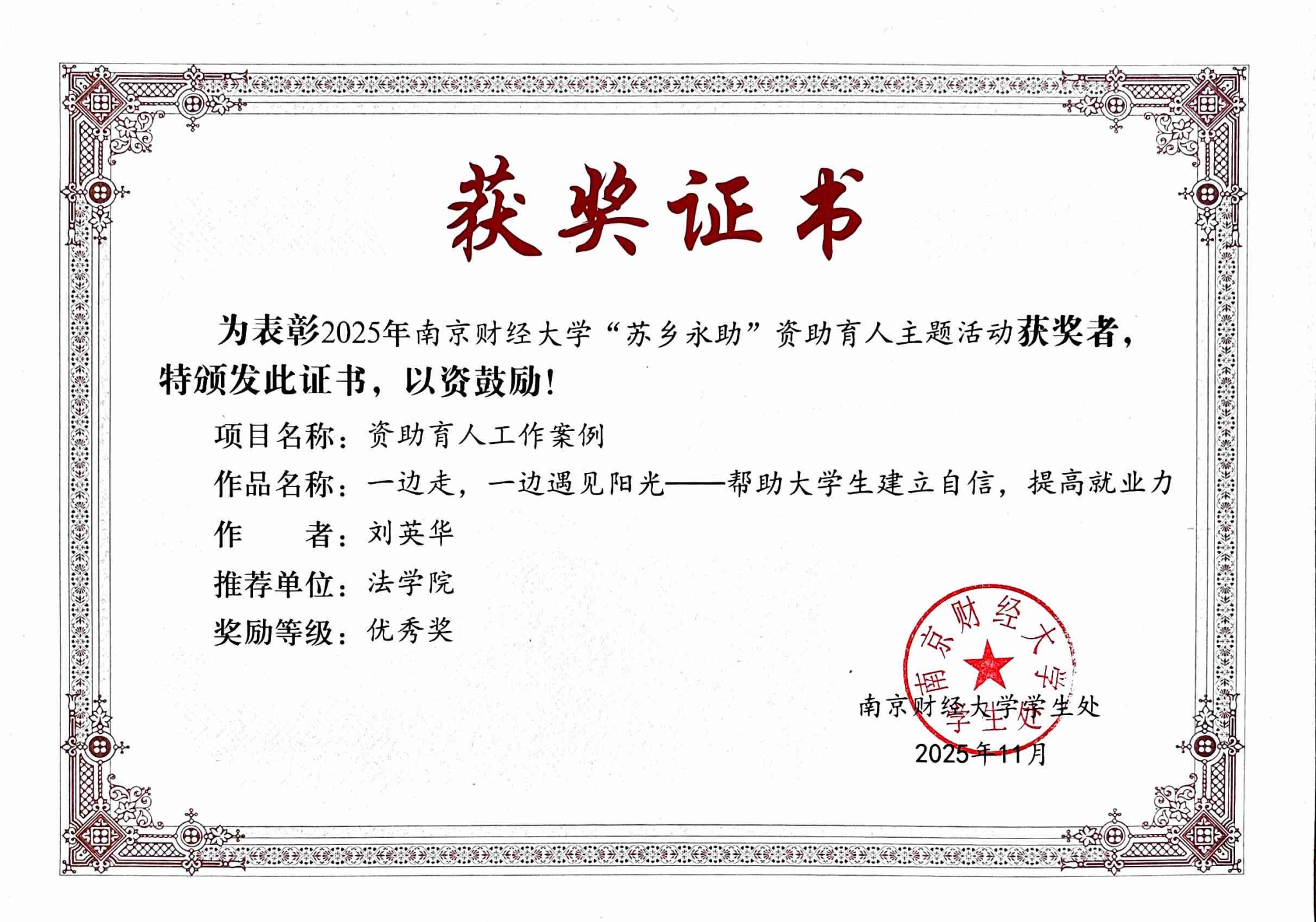 近日,2025年南京财经大学“苏乡永助”资助育人主题活动评选结果揭晓。AG娱乐 党委副书记刘英华老师的资助育人工作案例《一边走,一边遇见阳光——帮助大学生建立自信,提高就业力》荣获优秀奖,充分展现了AG娱乐 在资助育人工作中的扎实成效与创新实践。